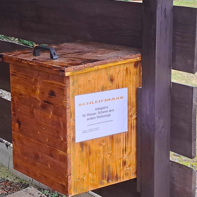 Für alle unsere Kunden haben wir eine Ablagebox eingerichtet, wo Sie auch außerhalb der Öffnungszeiten Ihr Schleifgut abgeben können. Die Box wird täglich geleert.